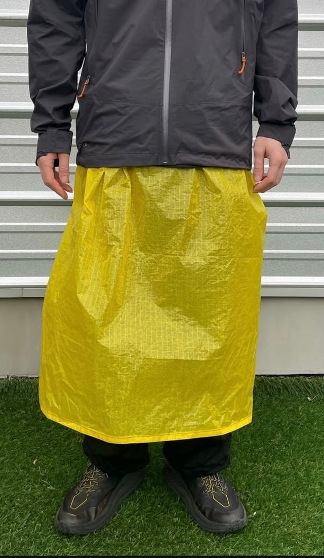 spin skirt spinnaker (sail cloth) polyester 約142cm × 72cm 約65g このspinskirtに使った生地は ポリエステルのスピンネーカー生地。 ヨットなどの帆船において 追い風で効率よく進むために設計された帆に使われる生地です。 軽量かつ強度がある生地ですので、 近年アウトドアによく使われるようになりました。 シルナイロンのようにしなやかさはありませんが、 ハリがあるので、スカートを履いた時に足にまとわりつく事がなく 雨に濡れても保水しないので、重量が増える事はほとんどありません。 パリパリ音がするほどハリがある生地ですので、 最初は音が気になると思いますが、 使用していくうちに、生地が馴染んでいき 音も小さく、しなやかになっていく。 そんな経年劣化も楽しめる生地となっています。 この商品に収納袋は付属いたしません。 スピンネーカー生地はハリがあるため、 適当にぐちゃぐちゃに収納袋に入れると 嵩がかなり増えてしまうので、 今回は付属しない事としました。 少し手間ですが、 ざっくり『折り畳んで』ゴムでまとめて下さい。 折りたたむ事で小さくコンパクトにまとめられます。 ハリがあるので簡易グランドシートとしても使えます。 森林限界以下の雨の日の山行や お守りレインパンツの代わりとして ビビットカラーで、もしもの時のエマージェンシー的な役割も,,,